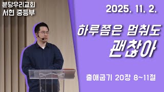 | 983 | [4계명] 하루쯤은 멈춰도 괜찮아 | 출애굽기 20장 8~11절 | 허현 목사 | 2025-11-02 |